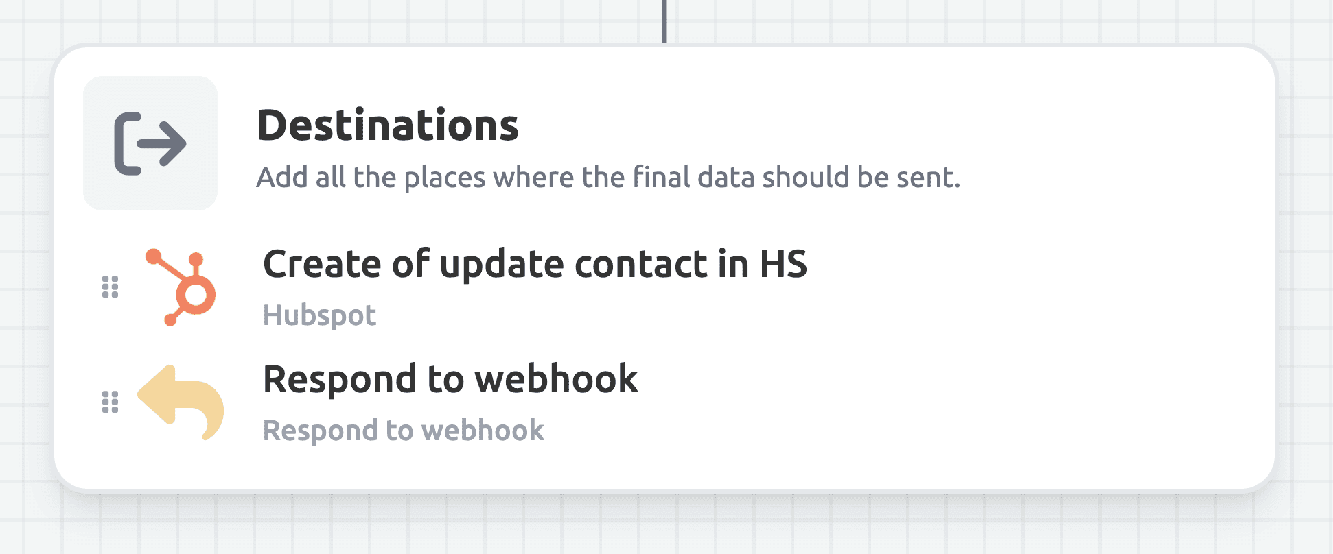 Destinations are the final step of a workflow: your own platforms and tools where the processed data will be delivered. All the information collected and transformed in the previous steps flows into these endpoints.