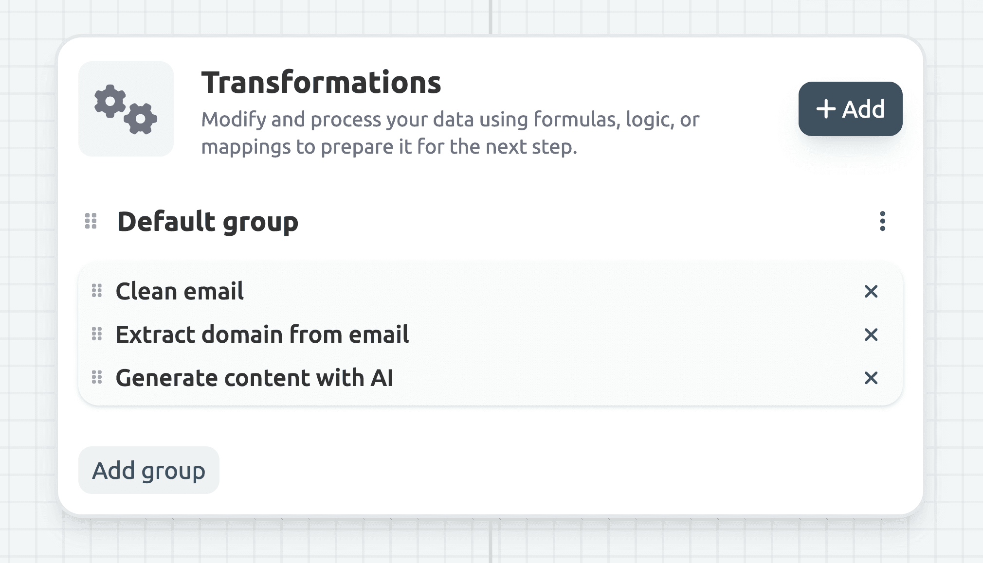 Think of them as small functions: each takes an input, modifies it, and returns a new output. You can chain multiple transformations together for more complex logic, or keep it simple with just one.