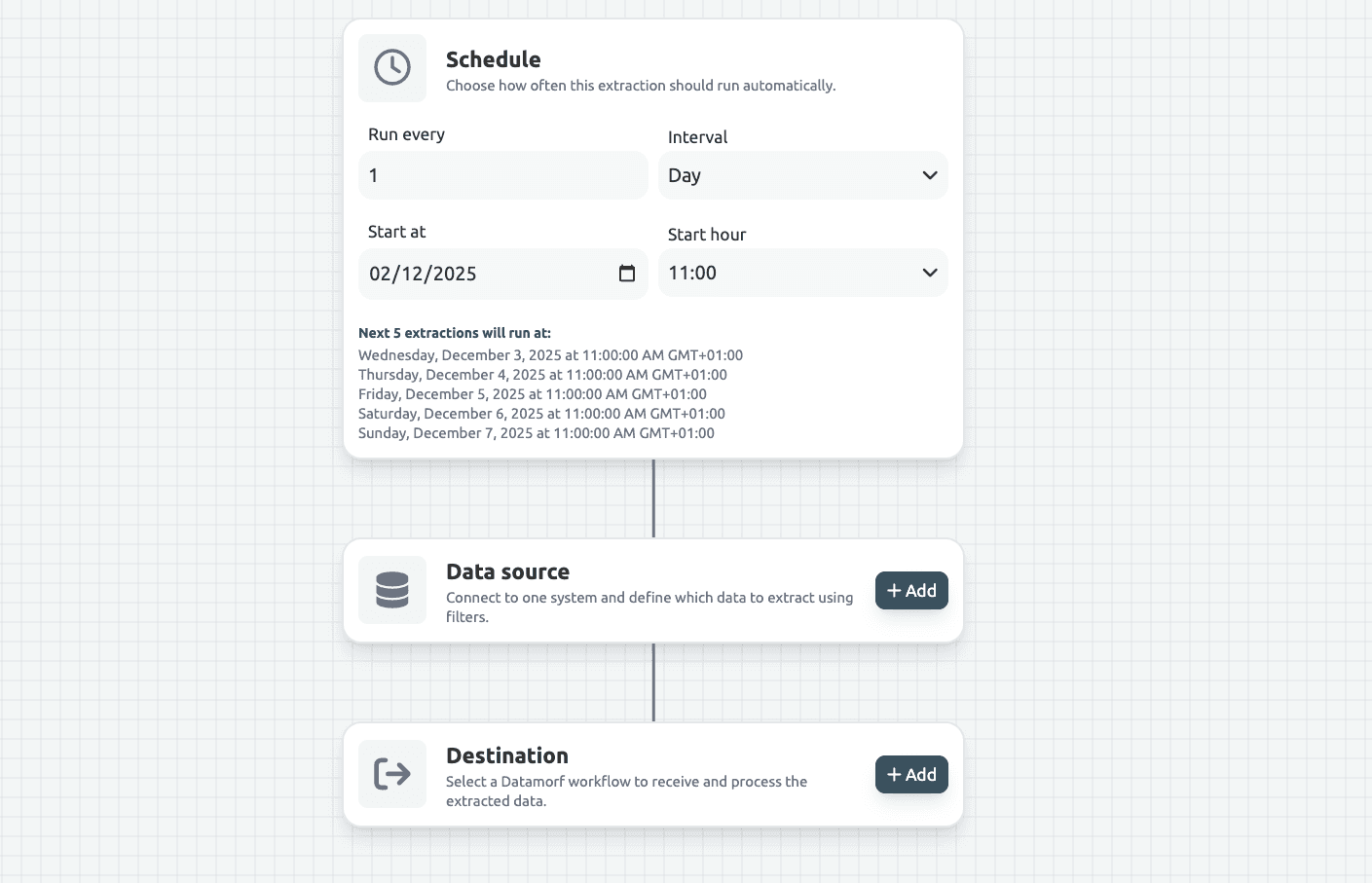 Datamorf supports frequencies such as: hourly, every few hours, daily, weekly, or even manual-only.