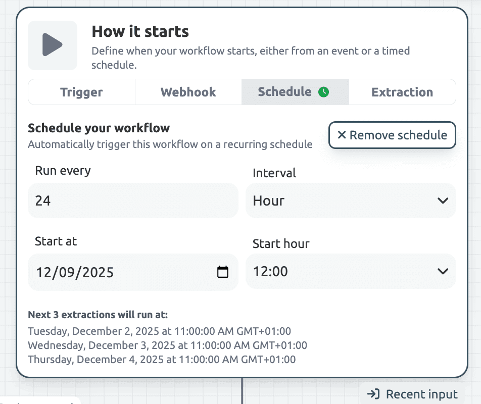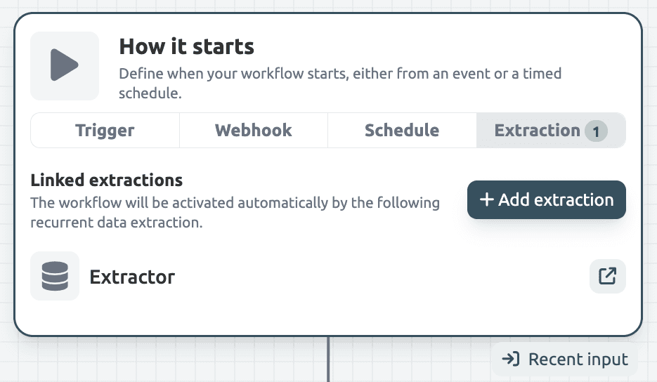 The Extractor module acts as a specialized trigger mechanism. Instead of waiting for events or external requests, the Extractor pulls data from CRMs, databases, spreadsheets, or SaaS tools on a schedule and activates a workflow for each record or batch of records.
