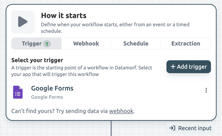 Triggers are the backbone of Datamorf workflows. Whether activated by integrations, webhooks, schedules, or Extractor, they define the moment automation starts and determine how data enters the pipeline. The variety of trigger types allows Datamorf to support real-time workflows, periodic batch jobs, and reliable reverse ETL, all with predictable pricing and a unified interface.