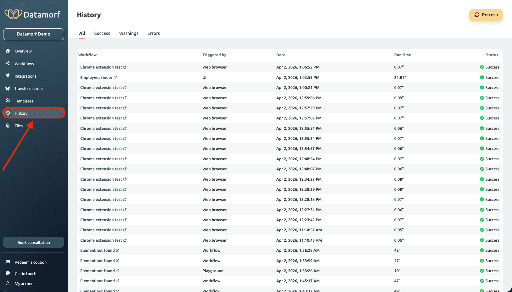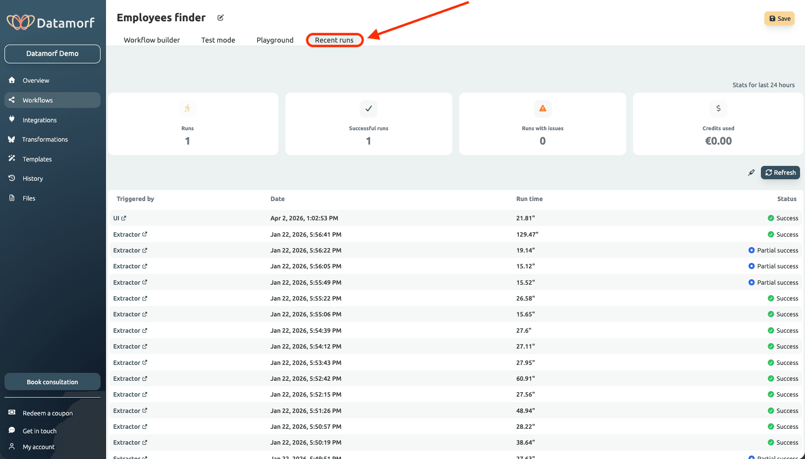 With Datamorf you have the possibility to review previous workflow run and know the time of execution, the run time, the state and the potential extra cost. It is particularly useful to detect possible errors and make sure everything is going smoothly.