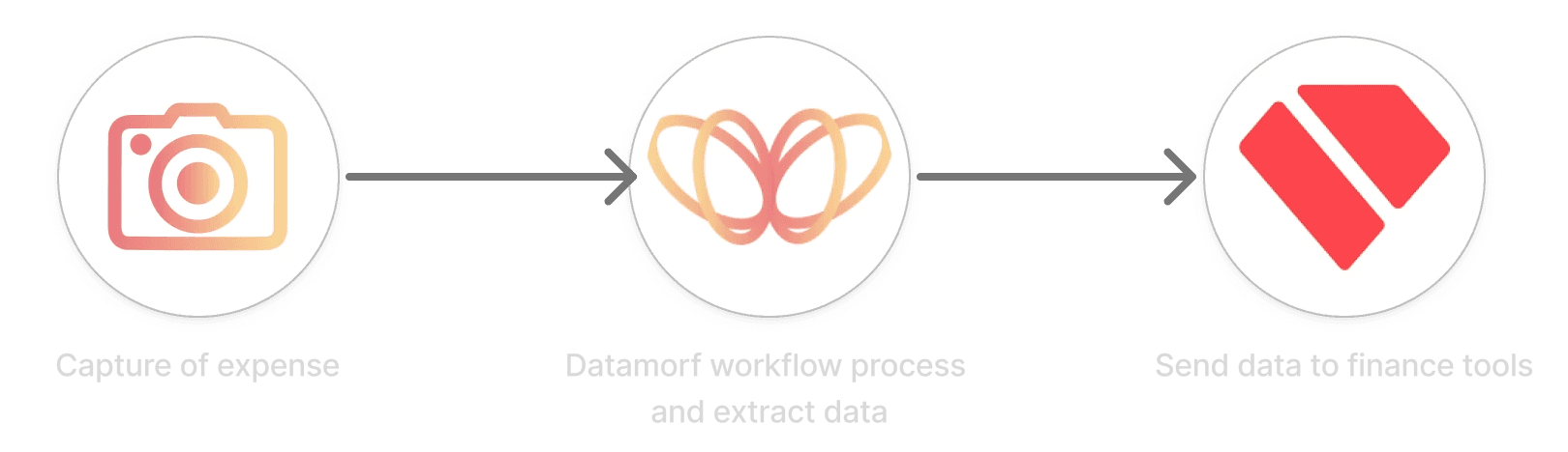Employees capture receipts using Datamorf Relay. Each receipt is routed into a Datamorf workflow that categorizes the expense, applies company rules, and sends the data to your expense or finance system.