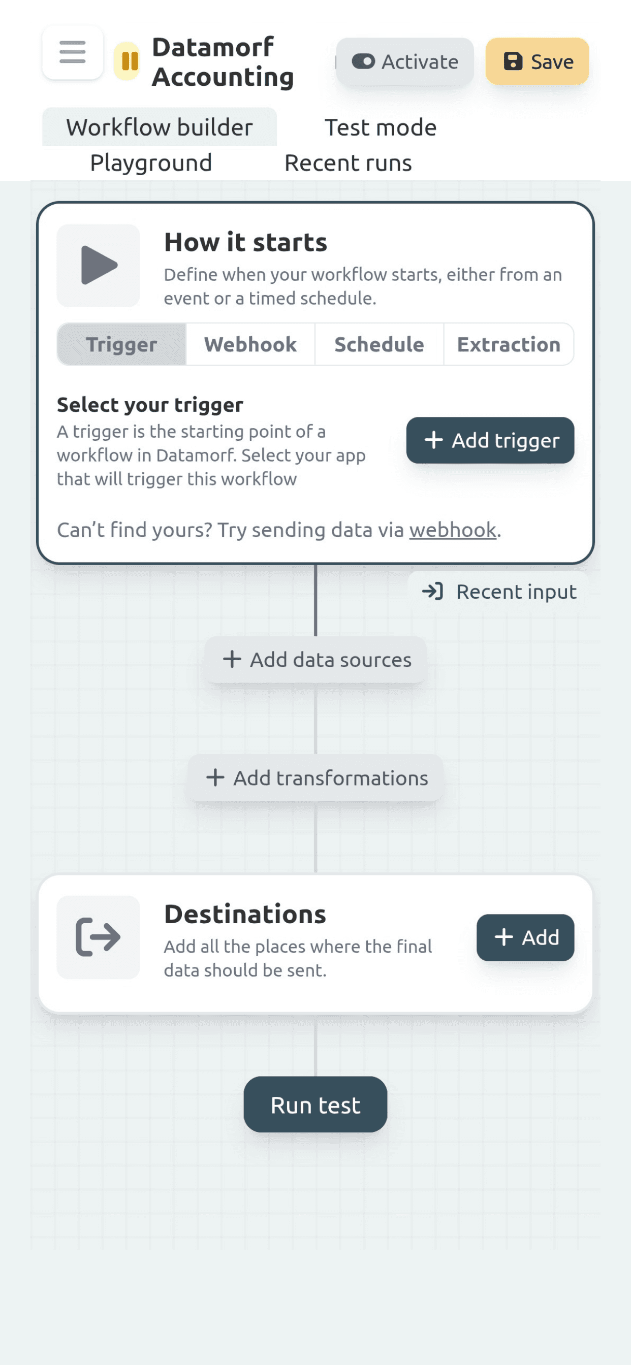 Once in Datamorf, your workflow takes over, extracting data, applying logic, and sending results to accounting systems, databases, CRMs, or any other connected tool.
